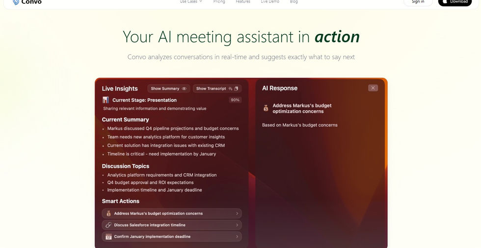 Convo is an AI-powered meeting assistant that provides real-time support during discussions. It listens, understands context, and suggests what to say next, helping users handle tough questions, recall past details, and stay ahead in every conversation. Ideal for professionals who want smarter, more efficient meetings without missing key moments.