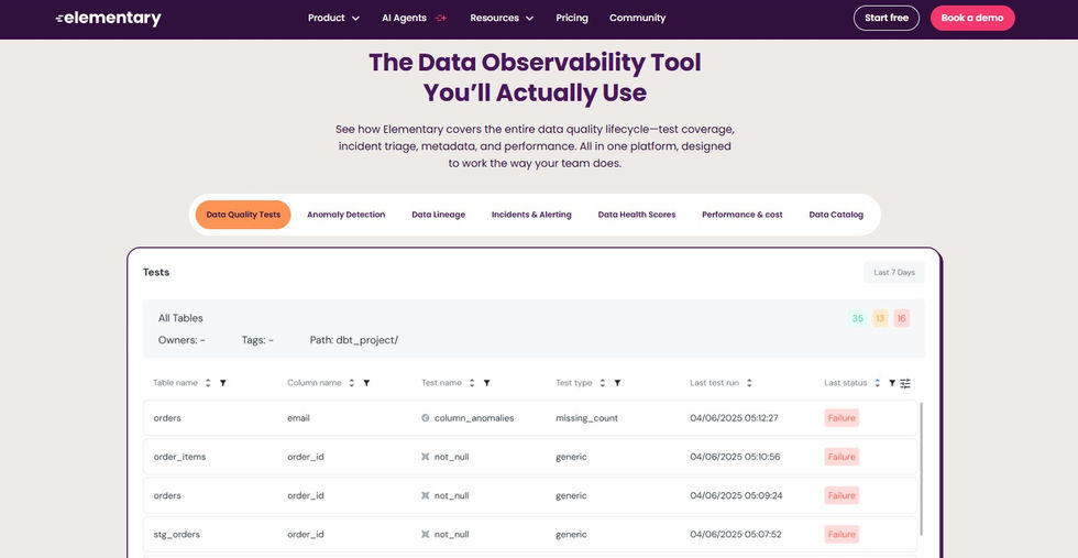 Elementary is an open-source data observability and monitoring platform that integrates with dbt to provide data quality testing, lineage, and monitoring.