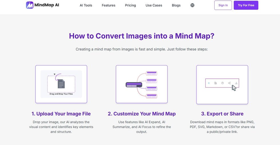 MindMap AI’s Image-to-Mind Map Generator transforms static visuals into editable, interactive mind maps. Upload any photo, scanned document, infographic, or whiteboard snapshot, and the AI extracts key ideas, organizes them visually, and generates a clean, customizable mind map. Ideal for students, educators, and professionals who want to convert notes, sketches, and research visuals into structured, shareable knowledge.