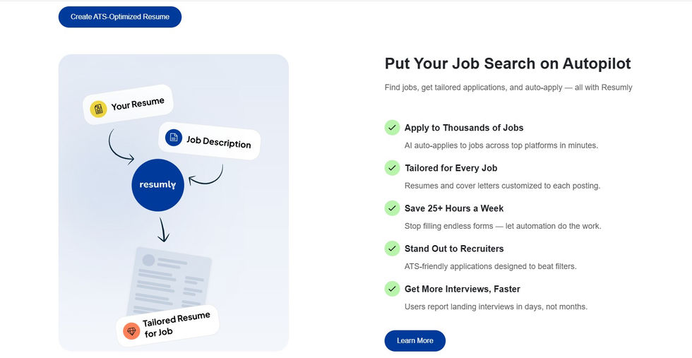 Resumly is an AI-powered resume builder and job application assistant that helps you land your next role faster. With advanced automation and smart personalization, Resumly instantly creates tailored resumes and cover letters, optimizes your LinkedIn profile, and even auto-applies to thousands of jobs across top ATS platforms.