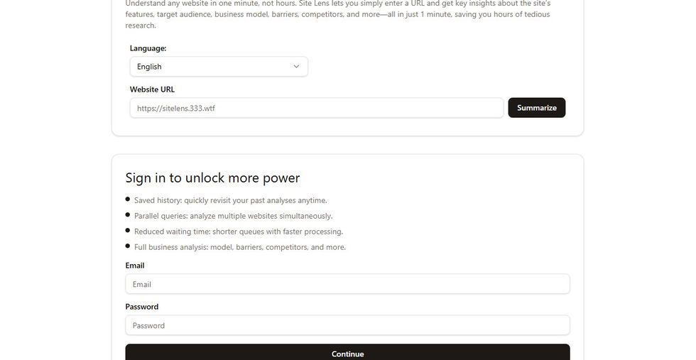 Site Lens is an AI-powered website analyzer that delivers instant insights from any URL. In just one minute, it breaks down a site’s features, target audience, business model, market barriers, and key competitors—saving hours of manual research. Ideal for marketers, entrepreneurs, and analysts, Site Lens transforms web intelligence into clear, actionable insights for faster business decisions.